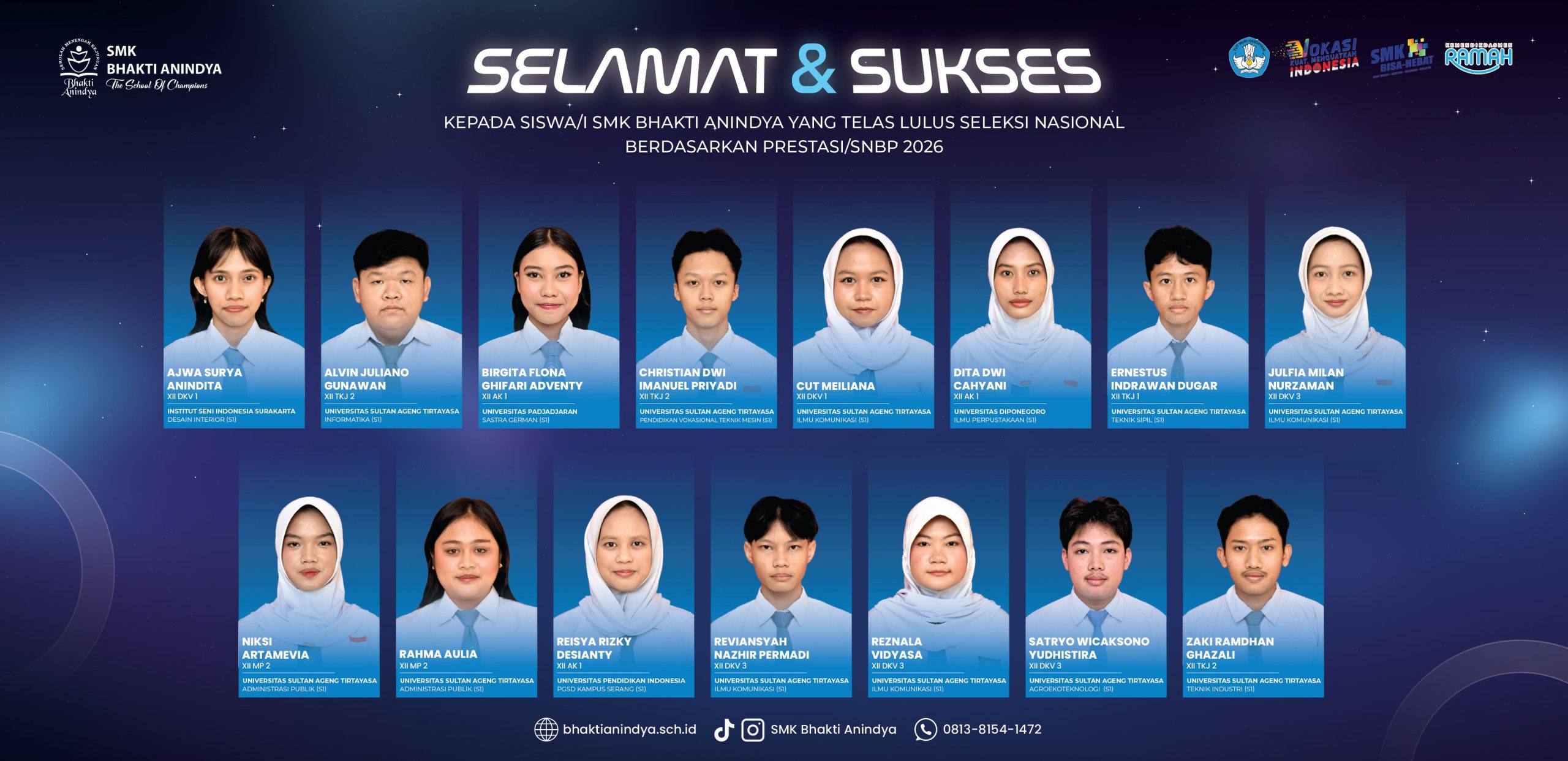 Keluarga besar SMK Bhakti Anindya dengan bangga mengucapkan selamat dan sukses kepada siswa-siswi yang telah lulus Seleksi Nasional Berdasarkan Prestasi (SNBP) tahun 2026.
